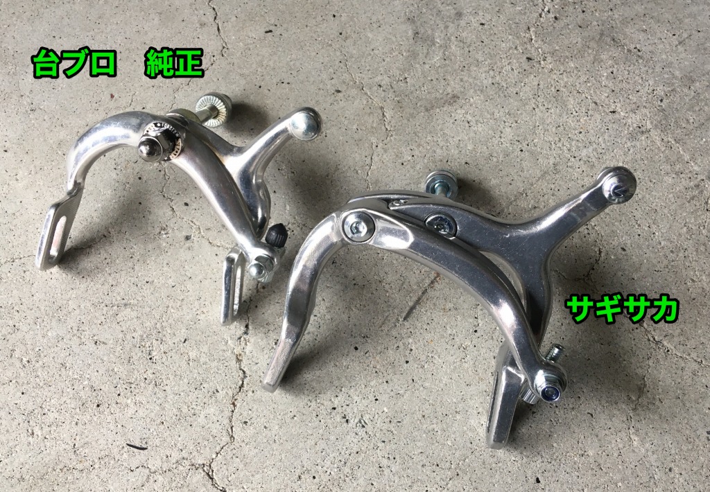 純正ブレーキを取り外して並べてみました。左が純正、右がサギサカです。